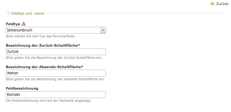 Dann findet man innerhalb eines Formulars den neuen Feldtyp „Seitenumbruch“. Dieses Feld setzt ihr überall dort ein, wo ihr mit einer neuen Seite anfangen wollt. Das Formular bleibt im Backend also in einem einzelnen Formular zusammengefasst und wird nur im Frontend durch die Benutzung der „Seitenumbruch“ Elemente in mehrere Seiten aufgeteilt. Wichtig ist hier, dass ihr die Felder im Seitenumbruch-Element richtig ausfüllt. Die „Zurück-" und „Absende-Schaltfläche“ könnt ihr einfach mit „Zurück“ und „Weiter“ ausfüllen. Das sind die beiden Buttons, die zur Navigation unter den auszufüllenden Feldern erscheinen. Dies müsst ihr für jeden Seitenumbruch separat angeben. Das Feld „Feldbezeichnung“ ist quasi als „Überschrift“ der einzelnen Schritte zu verstehen, und wird für die separate Navigation benötigt. Als Beispiel: Ihr habt zuerst vier Felder für Kontaktdaten im Formular. Dann fügt ihr den Seitenumbruch ein und gebt als „Feldbezeichnung“ „Kontakt“ ein. Die Bezeichnung gilt also immer für die vorangegangene Seite bzw. Felder. Die Seitenumbrüche fügt ihr dann so oft in eurem Formular ein, wie ihr mögt. Zu beachten ist nur noch folgendes: Ihr dürft das Formular nicht mit dem Contao-eigenen „Absendefeld“ beenden, um das Formular abzusenden, sondern müsst das Formular mit einem weiteren Seitenumbruch abschließen. Hier könnt ihr dann in der Absende-Schaltfläche von „Weiter“ auf z.B. „Formular absenden“ wechseln.