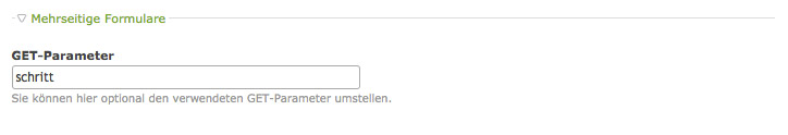 Ich gehe hier davon aus, dass ihr bereits über den Formulargenerator ein Formular mit euren gewünschten Feldern angelegt habt. In den Formulareinstellungen eines Formulars findet ihr zuerst ganz am Ende die neue Option „GET-Parameter“. Hier lässt sich der Parameter, der in der URL für die einzelnen Formularschritte verwendet wird, einstellen. Mit dem Parameter schritt erhält man beispielsweise dann die URL www.meinedomain.de/formular.html?schritt=1. Dies ist aber hauptsächlich eine kosmetische Anpassung.